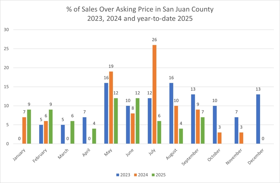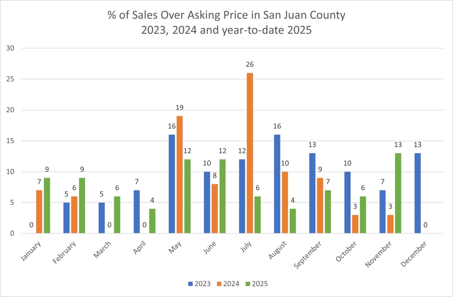 This graph shows the percentage of properties sold over asking price in San Juan County by month for 2023, 2024 and year-to-last-month 2025 for all properties.