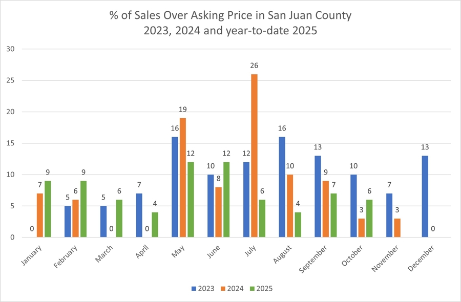 This graph shows the percentage of properties sold over asking price in San Juan County by month for 2023, 2024 and year-to-last-month 2025 for all properties.