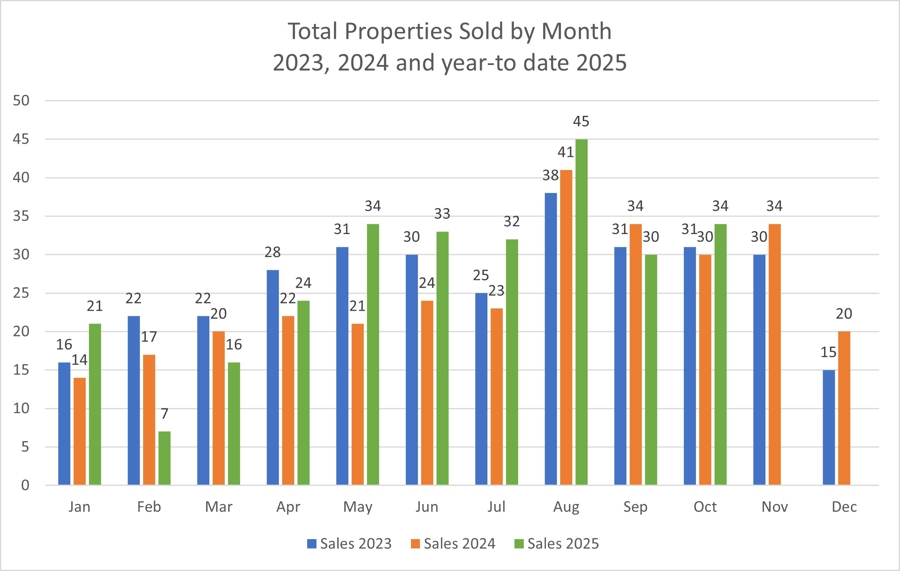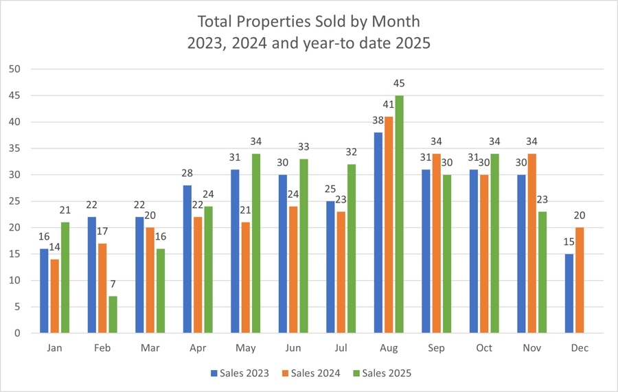 The following graph shows a comparison between properties sold in San Juan County for 2023, 2024 and year-to-last-month 2025.