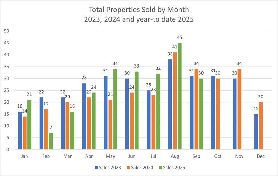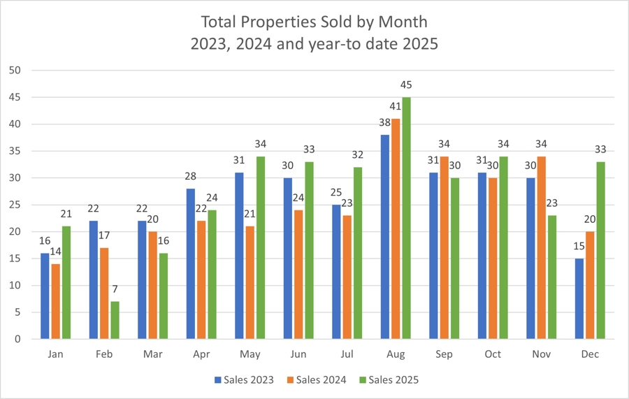 The following graph shows a comparison between properties sold in San Juan County for 2023, 2024 and year-to-last-month 2025.