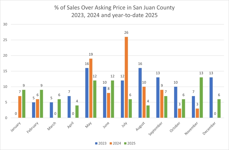 This graph shows the percentage of properties sold over asking price in San Juan County by month for 2023, 2024 and year-to-last-month 2025 for all properties.